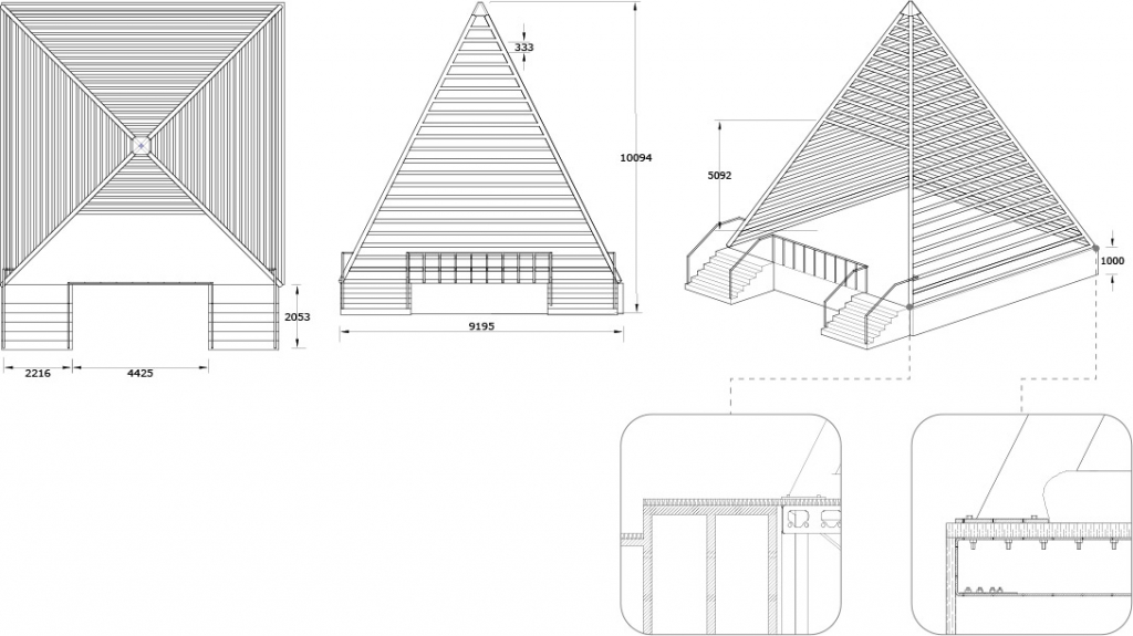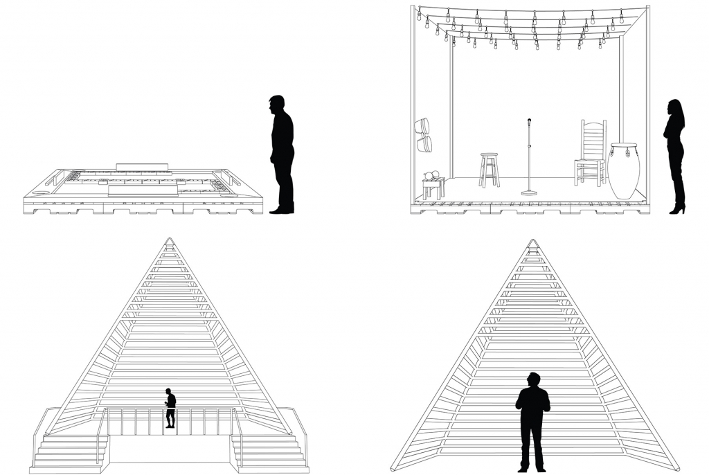 The main construction piece was the VIP pyramid which was made out of metal tubes soldered in shape. The structure was attached to a truss base covered in black painted plywood to conceal from the view. This was then dismantled and stored for future use.